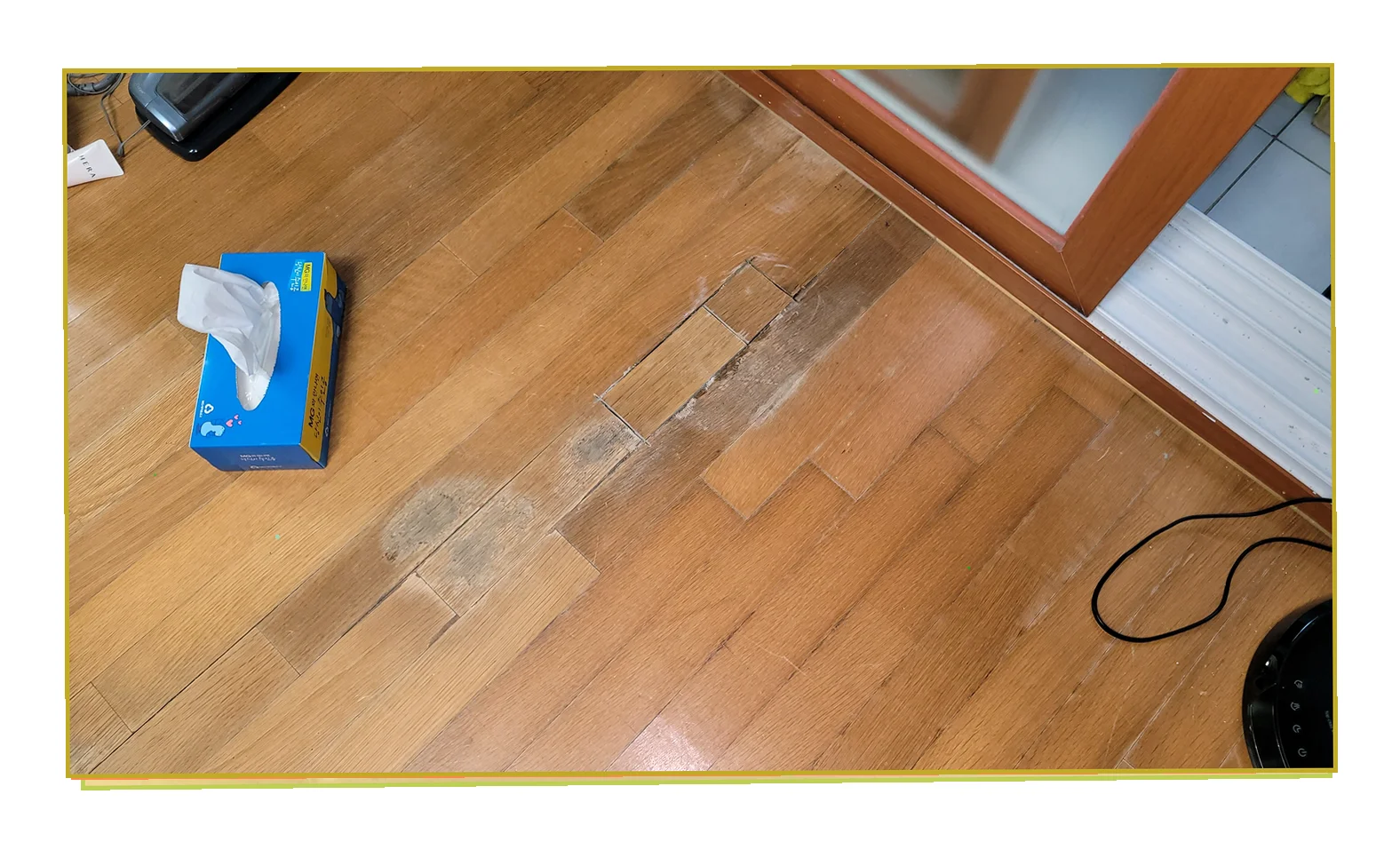 구석구석 조사한 결과 플렉시블 호스의 경년 열화 에서 물이 새고 있었습니다.